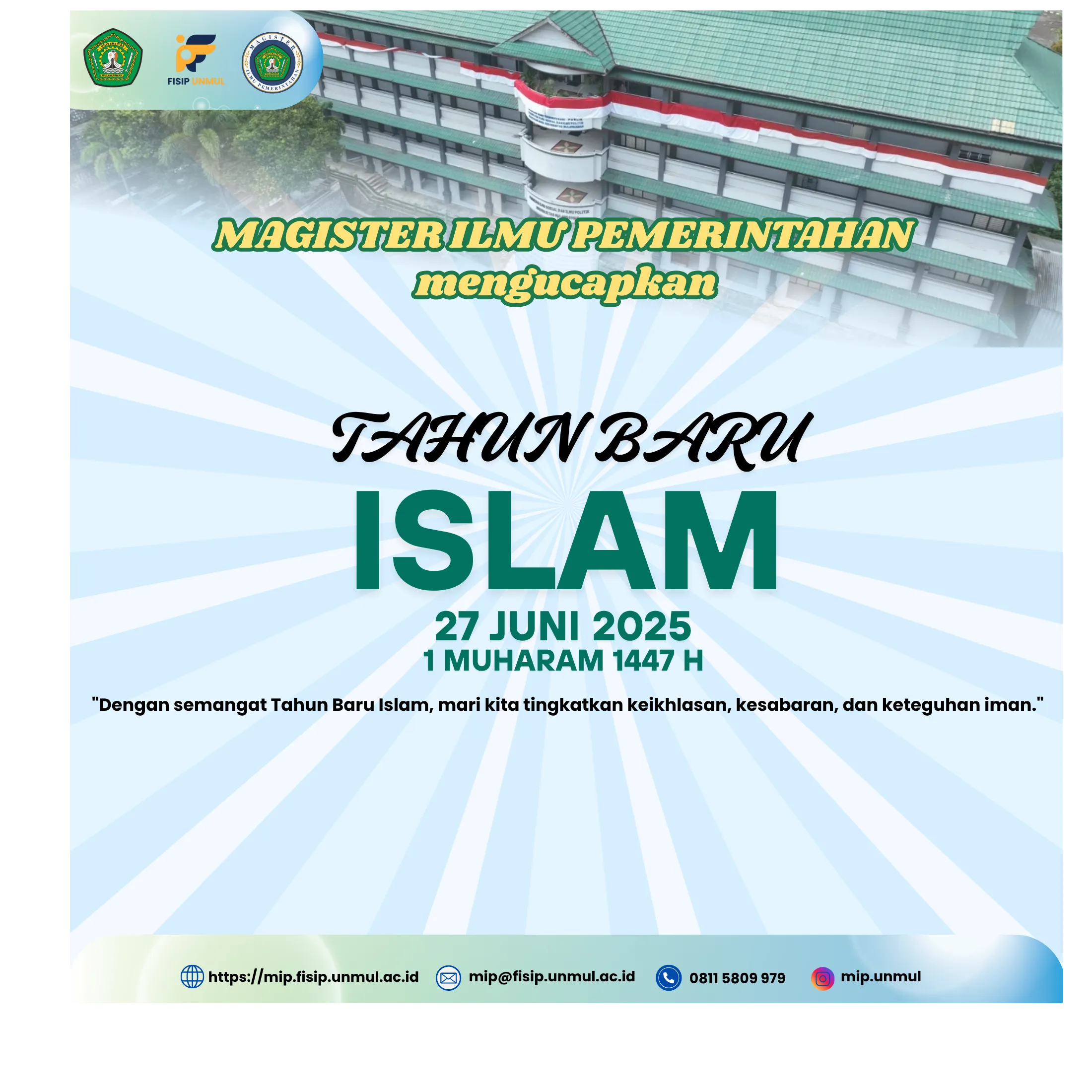 Kami segenap keluarga besar Magister Ilmu Pemerintahan FISIP Universitas Mulawarman mengucapkan Selamat Tahun Baru Islam 1 Muharam 1477 H. Semoga tahun baru ini membawa keberkahan, kedamaian, dan semangat baru dalam membangun integritas, keilmuan, dan pengabdian kepada masyarakat. Mari kita jadikan momentum hijrah sebagai inspirasi untuk terus bergerak menuju perbaikan diri dan lingkungan,”