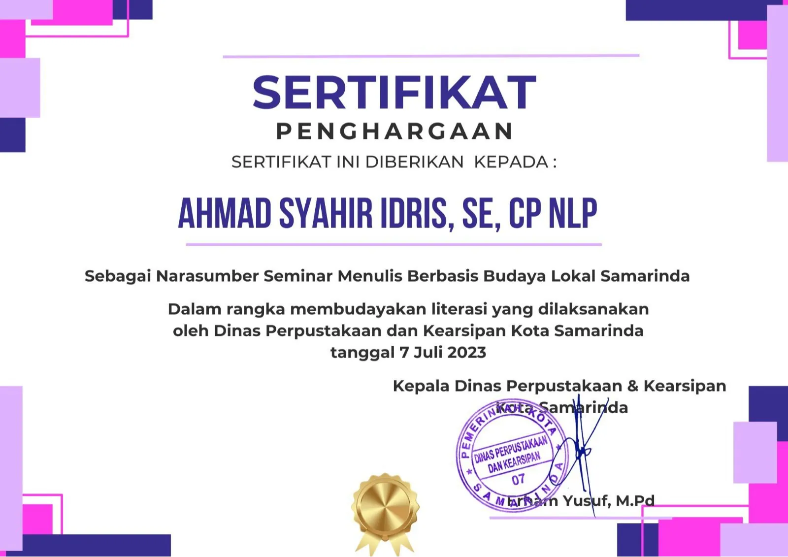 Samarinda, 7 Juli 2023 — Ahmad Syahrir Idris, SE, CP NLP, mahasiswa Magister Ilmu Pemerintahan Universitas Mulawarman, tampil sebagai narasumber utama dalam seminar bertema “Menulis Berbasis Budaya Lokal Samarinda”. Acara ini diselenggarakan oleh Dinas Perpustakaan dan Kearsipan Kota Samarinda dengan tujuan untuk membudayakan literasi di kalangan masyarakat.