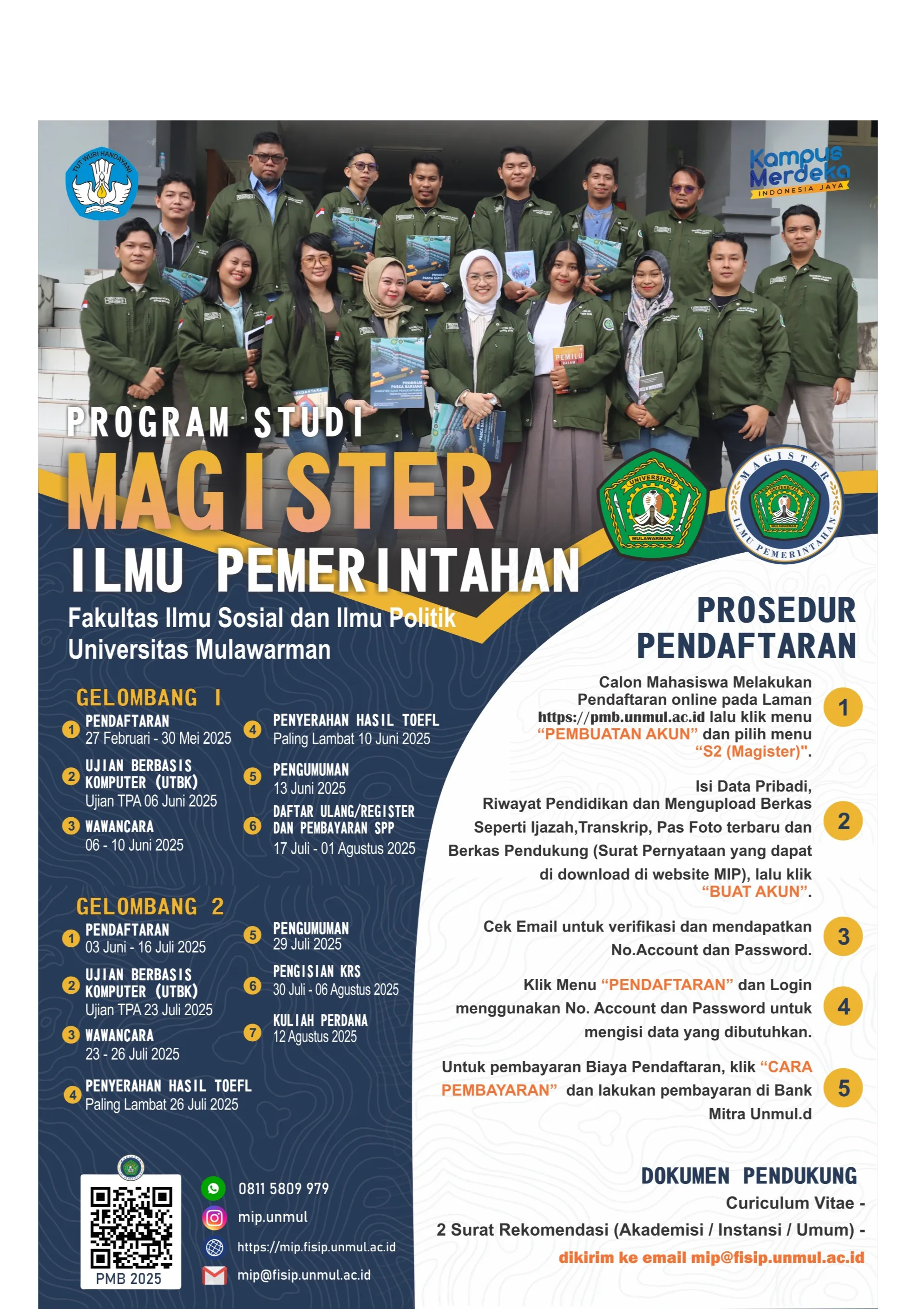 Bergabunglah bersama kami di Program Studi Magister Ilmu Pemerintahan FISIP Universitas Mulawarman! Kami membuka kesempatan bagi para profesional dan lulusan S1 yang ingin mengembangkan pemahaman mendalam tentang ilmu pemerintahan. Program kami dirancang untuk menghasilkan lulusan yang kompeten dalam analisis kebijakan, manajemen publik, dan tata kelola pemerintahan. Dengan kurikulum yang relevan dan dosen-dosen berpengalaman, kami siap mengantarkan Anda meraih karir gemilang di bidang pemerintahan.