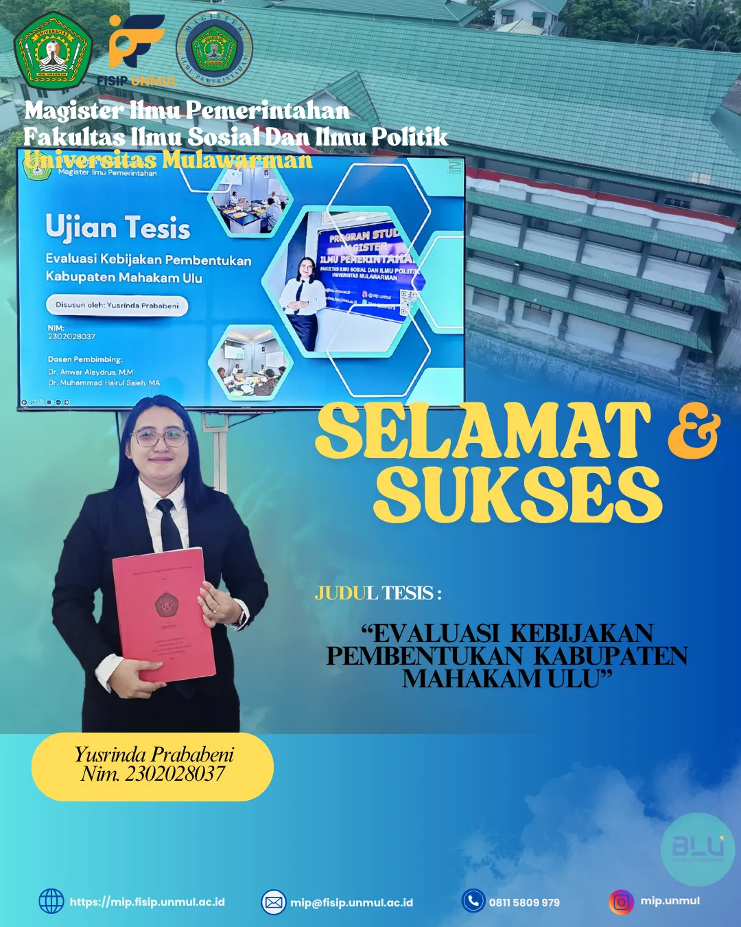 Samarinda – Ucapan selamat dan sukses disampaikan kepada Yusrinda Prababeni, mahasiswa Angkatan 2023 Kelas Kerjasama Mahakam Ulu, yang telah berhasil menyelesaikan ujian tesis Program Studi Magister Ilmu Pemerintahan, Fakultas Ilmu Sosial dan Ilmu Politik, Universitas Mulawarman (UNMUL). Ujian tesis tersebut dilaksanakan pada Selasa,05 Juni 2025, bertempat di Ruang Seminar Magister Ilmu Pemerintahan FISIP UNMUL.